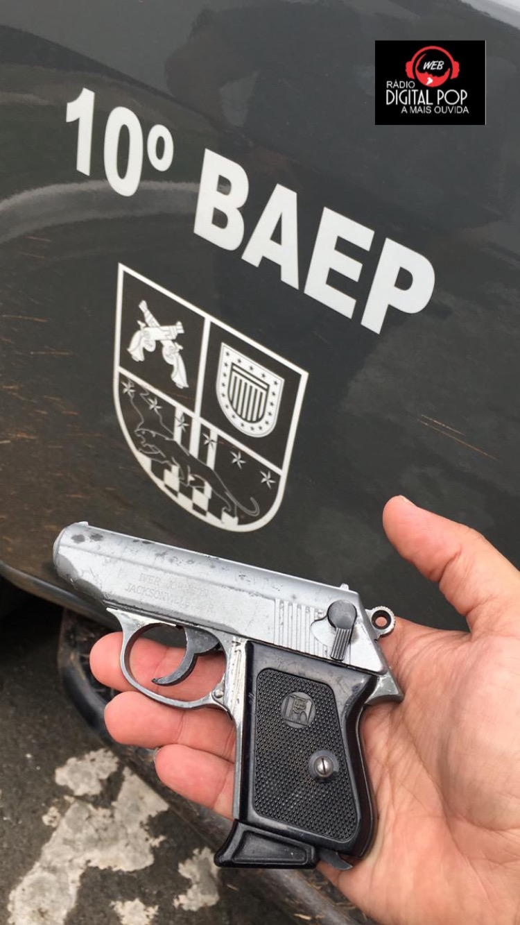 Deslocamos para o endereço e encontramos o portão aberto, no entanto, ao avistar a presença policial um indivíduo empreendeu fuga pelo fundo da residência, saltando um muro, porem sem êxito foi detido. Posteriormente indentificado como M.S. de imediato foi submetido a busca pessoal, e encontrado em suas vestes um Pistola Cal. 22 com 03 Munições intactas. M.S. confessou a participação no roubo e também indicou onde poderia estar um de seus comparsas, um individuo de vulgo Periquito, diligenciamos até o local, porém nao havia ninguém na residência.