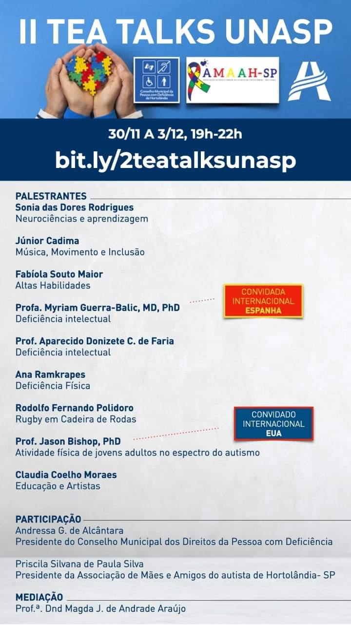 Diversos tipos de deficiência, transtornos globais de desenvolvimento, como o autismo, e altas habilidades/superdotação estarão na pauta de debates em Hortolândia. É o III TEA Talks, promovido pelo Unasp (Centro Universitário Adventista de São Paulo), em parceria com o CMDPCD (Conselho Municipal da Pessoa com Deficiência) de Hortolândia, órgão independente acompanhado pela Prefeitura. O evento tem como público alvo profissionais que lidam com a Educação Especial e Inclusiva. O primeiro aconteceu em junho e o segundo em agosto.