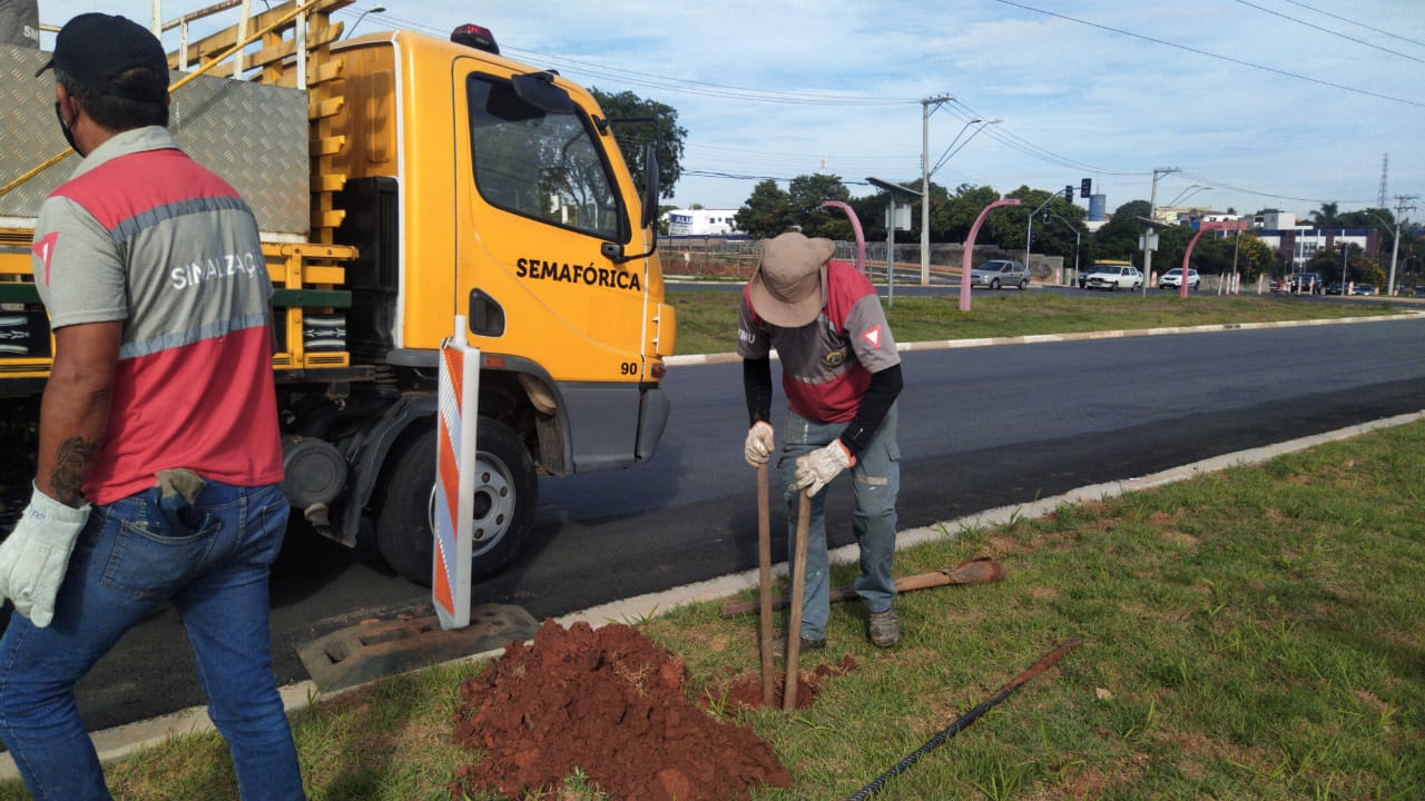 Técnicos do Setor de Sinalização Semafórica recolocaram uma coluna de orientação de tráfego. Em razão das obras realizadas no local, a placa de "Atenção, travessia de pedestres", que ficava próximo ao Hospital Municipal, tombou e precisou ser novamente afixada.
