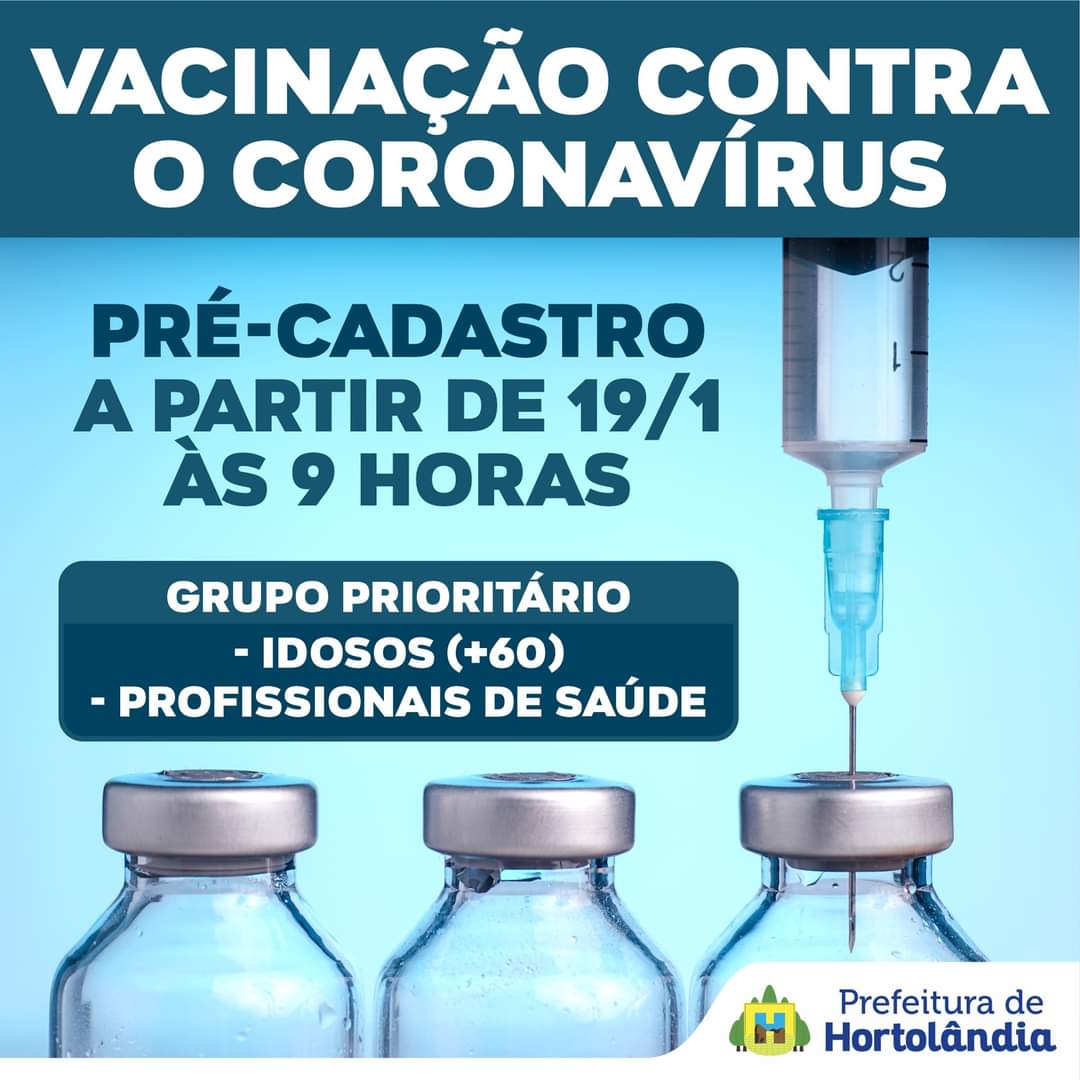A Prefeitura de Hortolândia inicia, nesta terça-feira (19/01), a partir das 9 horas, o pré-cadastro para o início da vacinação contra a COVID-19. Podem fazer o pré-cadastro pessoas inclusas na primeira fase do cronograma determinado pelo governo estadual: profissionais da saúde e pessoas acima de 60 anos. Conforme a programação já divulgada pelo governo estadual, a vacinação deve começar no dia 25 deste mês. De acordo com a Secretaria de Saúde, o pré-cadastro é para melhor organizar o agendamento para o início da vacinação e, com isso, evitar aglomeração, conforme os protocolos sanitários para evitar a disseminação do Coronavírus.