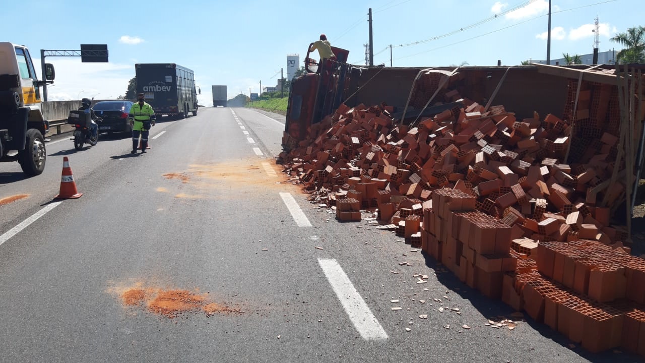Um caminhão carregado de tijolos tombou na manhã desta segunda-feira (15), na Rodovia Jornalista Francisco Aguirra Proença (SP-101), no KM 10, em Hortolândia.