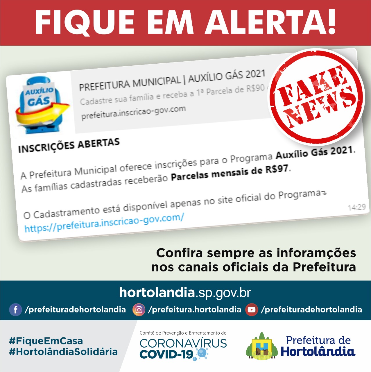A Prefeitura de Hortolândia, por meio da Secretaria de Inclusão e Desenvolvimento Social, alerta que é falsa a mensagem que está circulando pelas redes sociais sobre um Programa de Auxílio Gás. De acordo com o secretário de Inclusão e Desenvolvimento Social, Francisco Raimundo da Silva, o momento delicado de pandemia em que vivemos é um cenário propício para golpistas. "Por isso, é necessário sempre manter a desconfiança e procurar confirmar toda e qualquer informação, mesmo que disseminadas por familiares ou amigos", destacou. As informações confiáveis sobre projetos e ações da Prefeitura estão disponíveis no site da Administração Municipal (www.hortolandia.sp.gov.br) e nas redes sociais da Prefeitura.