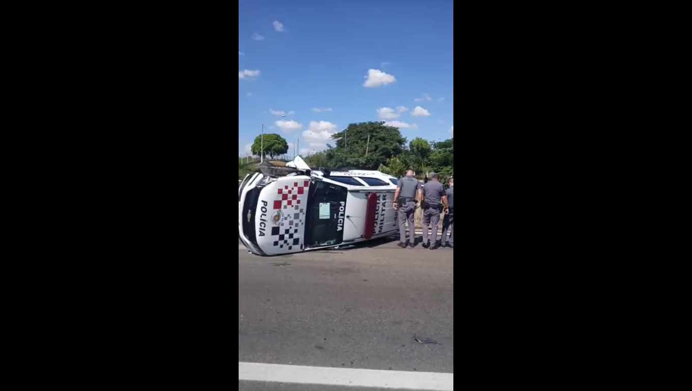Uma viatura da Polícia Militar capotou no início da tarde desta quarta-feira (28) na Rodovia SP-101, em Hortolândia.