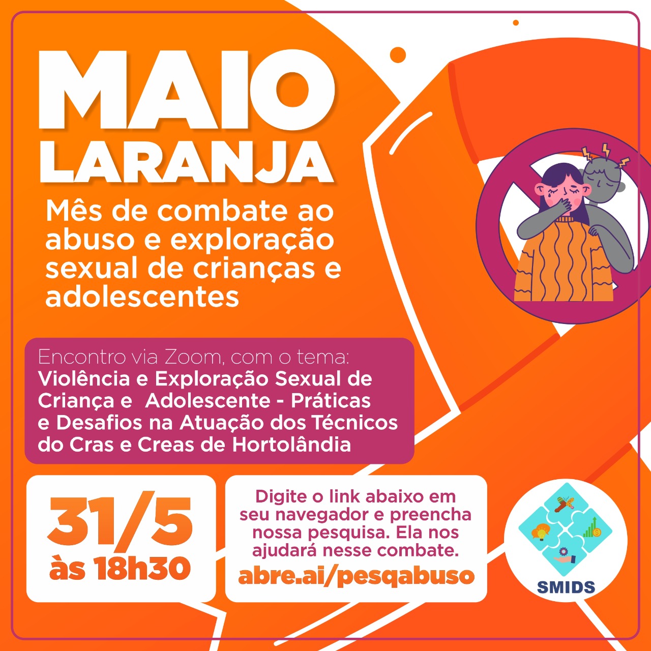 A Prefeitura de Hortolândia promove, nesta segunda-feira (31/05), às 18h30, encontro virtual sobre o Maio Laranja, campanha de combate ao abuso e exploração sexual de crianças e adolescentes. O debate, que reunirá profissionais da rede municipal de assistência social, é aberto à participação popular.