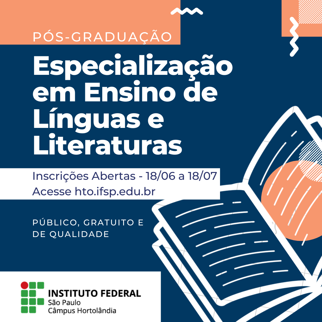 O Câmpus Hortolândia abre processo seletivo para o curso de Especialização em Ensino de Línguas e Literaturas. O objetivo do curso é qualificar profissionais que atuem, ou que desejem atuar, na área de Letras, Pedagogia e afins (Estudos Literários, Linguística, Linguística Aplicada), proporcionando, em nível de pós-graduação lato sensu, atualização e aprofundamento teórico-metodológicos necessários para o aperfeiçoamento de suas práticas didático-pedagógicas mais diversas.